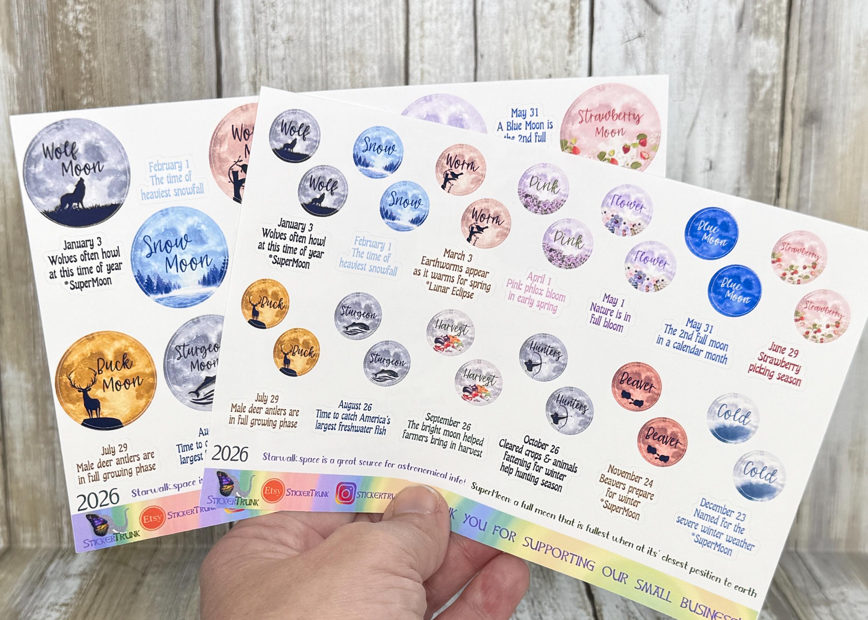 *Two size options: - 1" moons (1 moon per month, 12 moons + 12 descriptions = 24 stickers per sheet) OR - 1/2" moons (2 moons per month, 24 moons + 12 descriptions = 36 stickers per sheet) The sticker sheet measures 4.5" X 6.75".