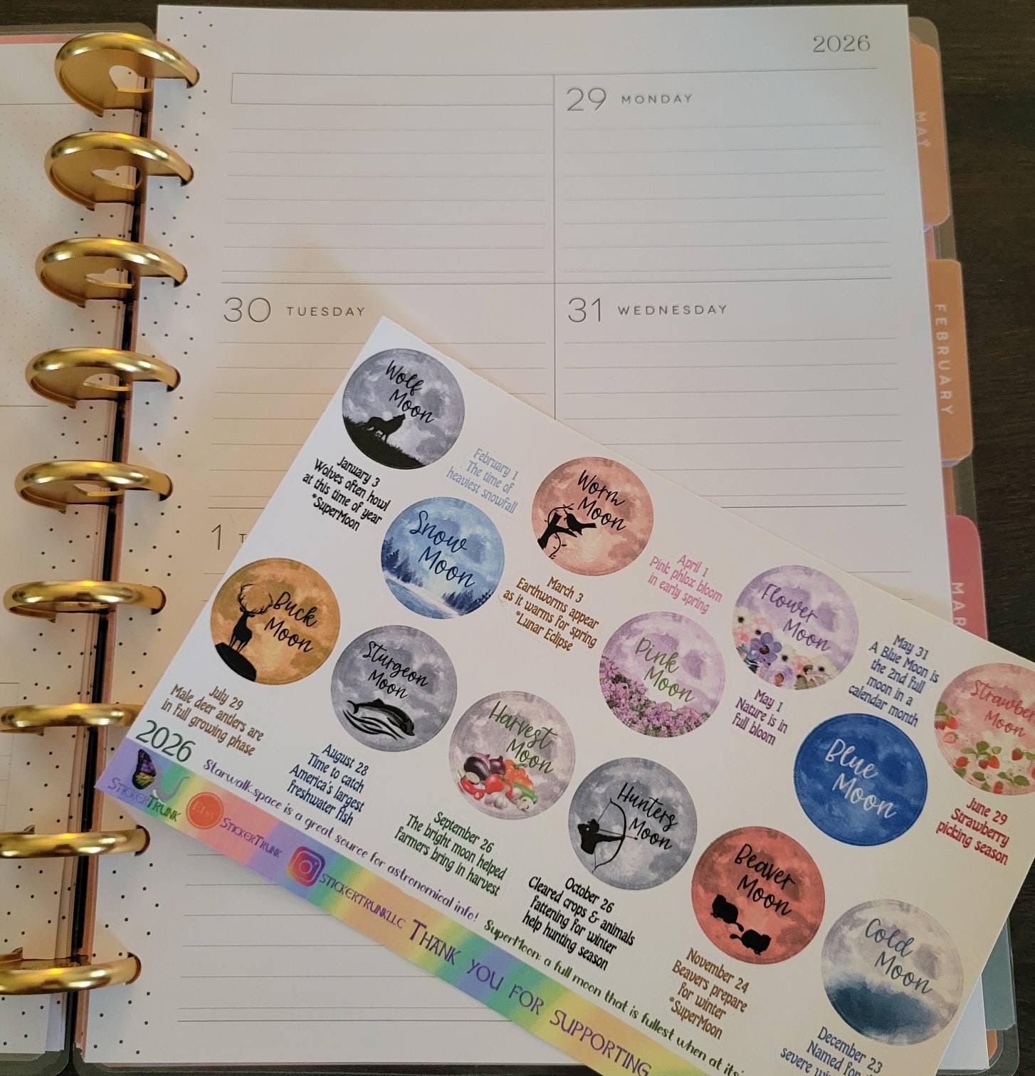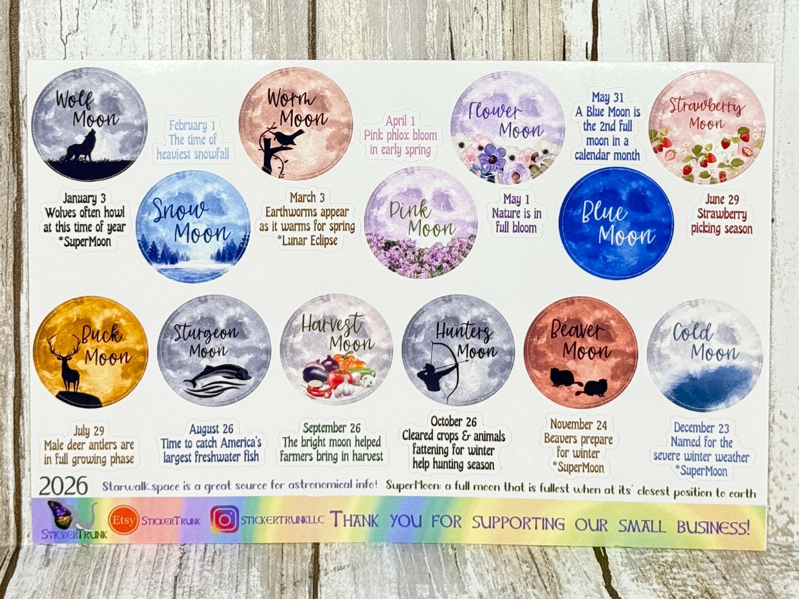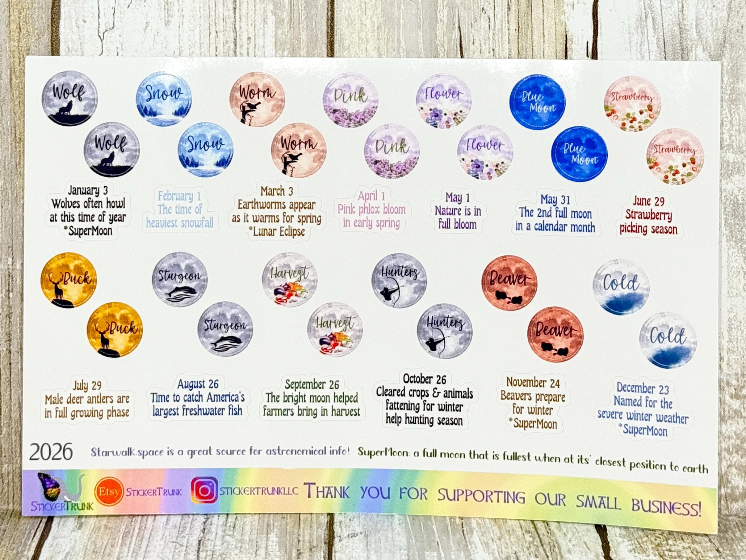 Each moon is shown with it's widely accepted name as well as artwork depicting the reason for the name. Most of these names are derived from Native American tradition as well as names used during Colonial times in North America. Below each sticker, I have listed the date of that Full Moon, an explanation of the name and I have noted if that moon is a Supermoon or Lunar Eclipse.